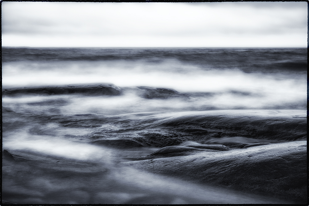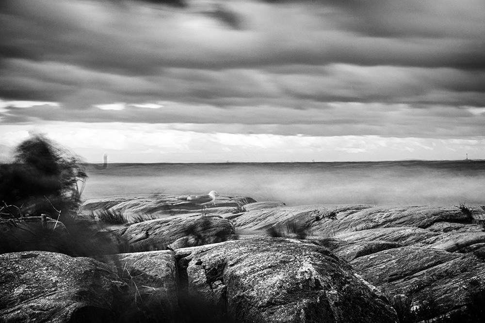 Att befinna sig på en klippa vid havet eller en riktigt stor sjö när det stormar är riktigt härligt. Man blir liksom impregnerad av frisk luft (och en del vatten), och man nästan tvingas att vara helt närvarande i stunden. Att fotografera under dessa förhållanden är en utmaning. Dels ska man förstås se till att man befinner sig på en säker plats. Såphala klippor och grov sjö är en farlig kombination; man vill definitivt inte hamna i vattnet! Dels, om man som jag gillar lite oskärpa och släpighet, bör man ha ett riktigt stadigt stativ och ett ND-filter (ND64-1000) framför objektivet.