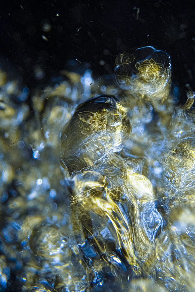 Ibland roar jag mig med att försöka fånga ögonblicksbilder i ett snabbt föränderligt ”mikrolandskap”. Luftbubblor i vatten är ett exempel på sådant. Bubblorna kan ge väldigt annorlunda bilder, där också fantasin ges spelrum. Ibland kan man tycka sig se en människa eller ett djur. Ibland något annat. Jag fascineras av vilka spännande bilder vattnet kan bjuda på, vare sig det är bland isformationer i en skogsbäck, undervattensbilder i sjöar och dammar eller i rent experimentella situationer där kamera, blixtar och ljus riggas vid vattenkranen i köket. Dessa bilder är från just ett sådant experiment i köket. Associera fritt!
