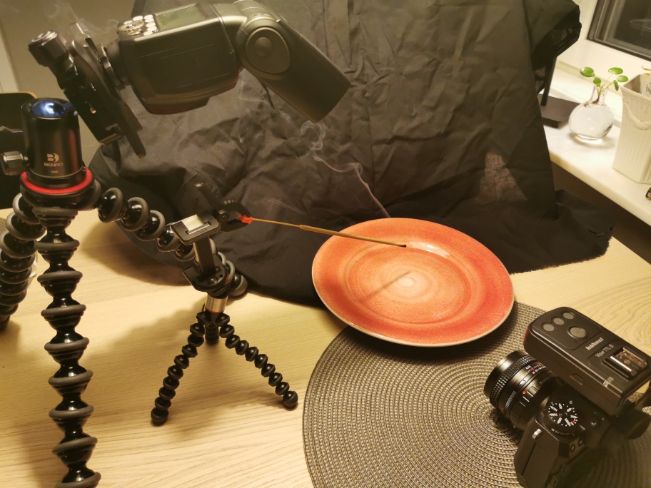 Här kommer några ytterligare bilder från experimenten med rökelse och blixt. Vissa är gjorda med en blixt från sidan och andra med två blixtar, en på vardera sidan. Några bilder är också speglade i Photoshop som en liten kreativ twist. Har också lagt in en BTS så ni ser hur enkelt upplägget är. Receptet är rökelsesticka, mörk bakgrund, blixt (en eller två) från sidan med 1/64 – 1/128 effekt (beror förstås på hur kraftig blixt man har), 60 mm brännvidd och f8-11, exponering för blixtsynk (vanligen 1/200 – 1/250 sek.) Lycka till!